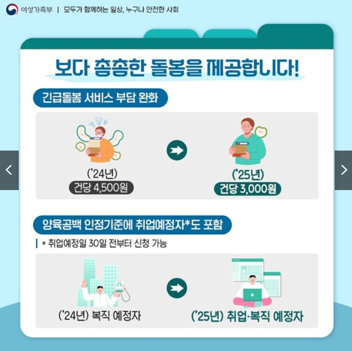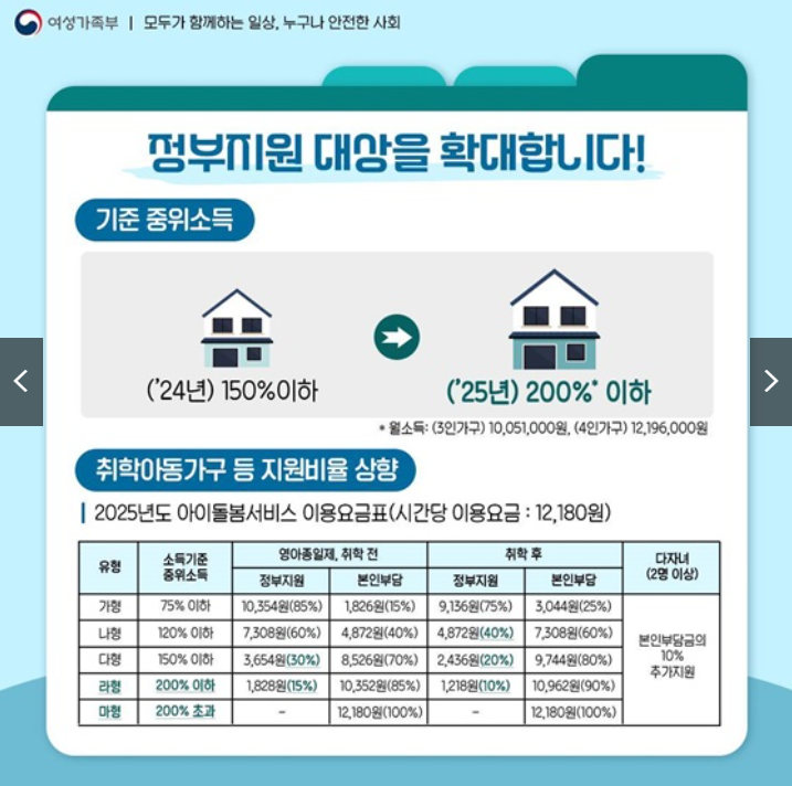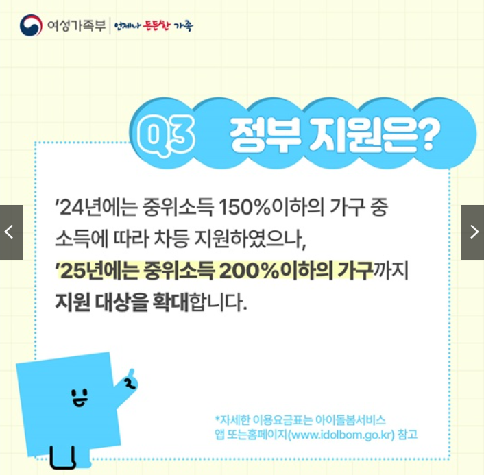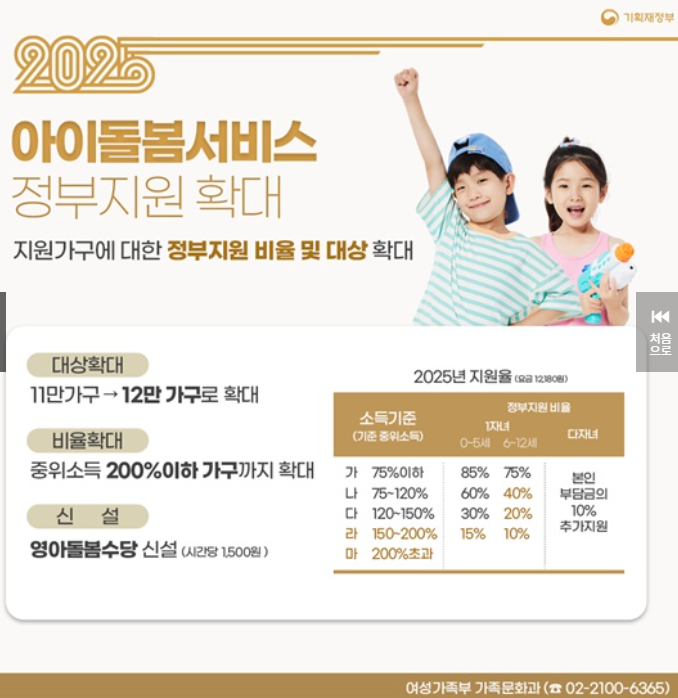 정부는 저출산 문제를 해결하고 부모의 육아 부담을 덜어주기 위해 2025년부터 아이돌봄 서비스 지원을 대폭 확대할 예정입니다. 이를 통해 더 많은 가정이 믿고 맡길 수 있는 보육 서비스를 이용하고, 맞벌이 가정의 일-가정 양립을 적극 지원하고자 합니다.