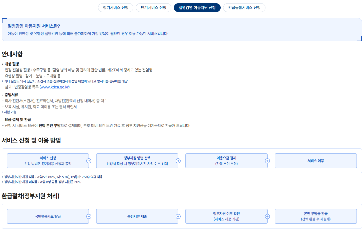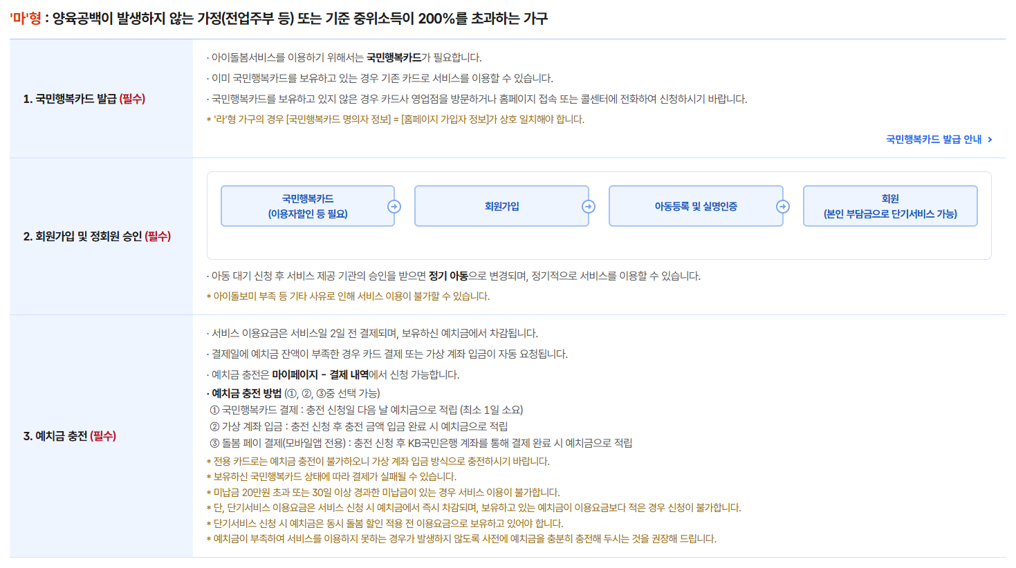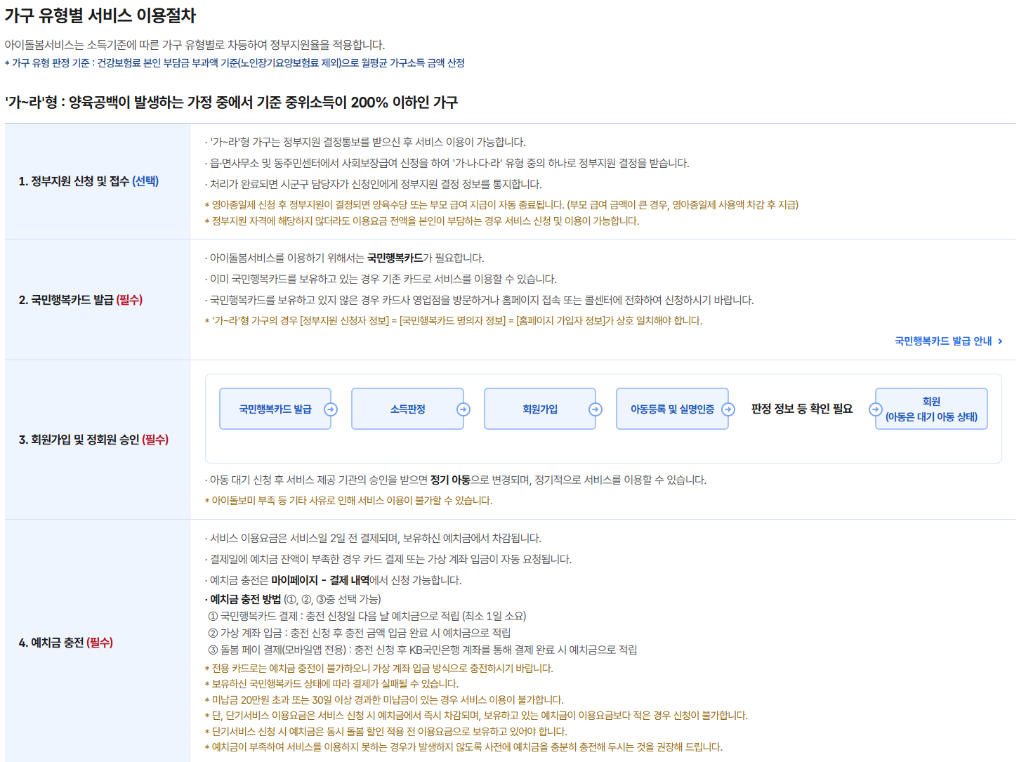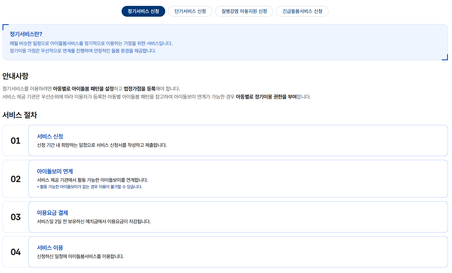 정부지원 신청: 정부24(www.gov.kr) 에서 신청하거나 아이돌봄서비스 공식 홈페이지(idolbom.go.kr)에서 신청 가능