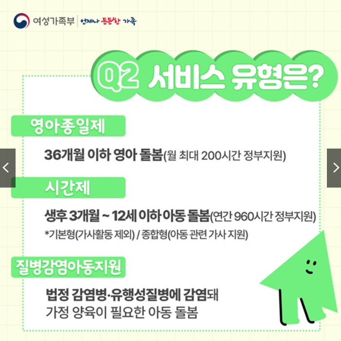 부모가 일시적으로 돌봄 공백이 발생할 때 이용할 수 있는 서비스로, 아이돌보미가 가정을 방문하여 일정 시간 동안 아동을 돌봐줍니다.