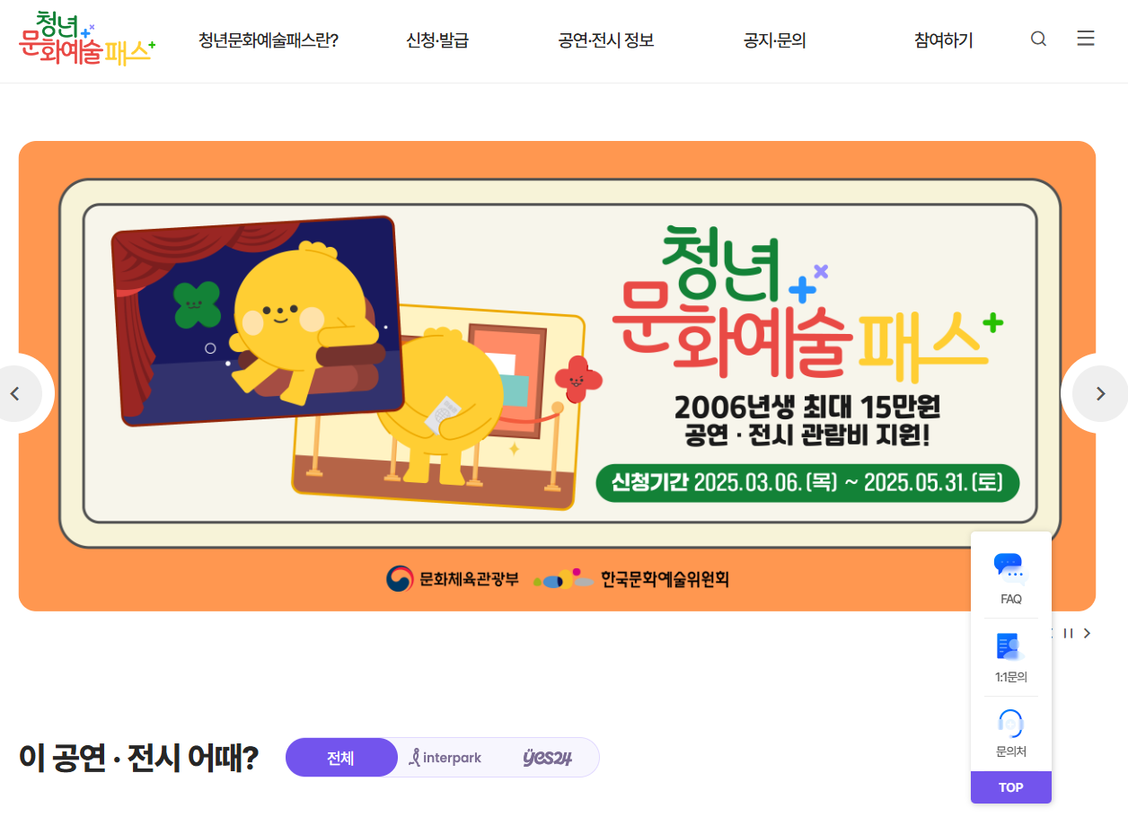 '청년 문화예술패스'는 일정 연령의 청년들에게 연극, 공연, 전시, 영화 등을 관람할 수 있도록 지원금을 제공하는 제도입니다. 홈페이지 바로가기