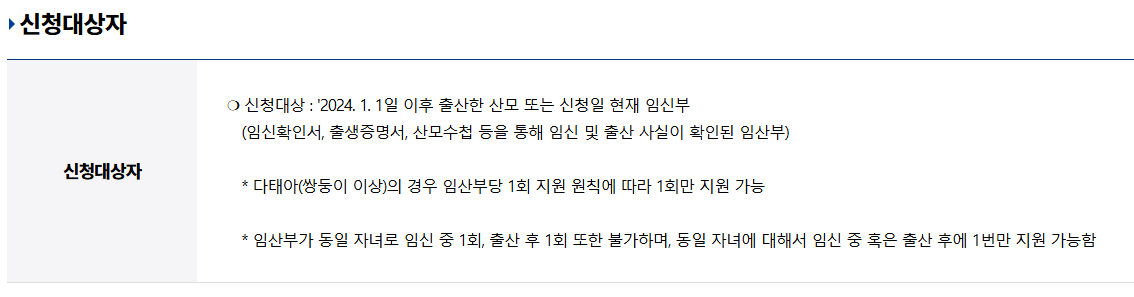 이 사업은 경기도에 거주하는 임신부 또는 출산 후 12개월 이내의 산모를 대상으로 합니다. 또한, 신청자는 주민등록상 주소가 경기도에 있어야 하며, 의료기관에서 발급한 임신 확인서나 출생증명서 등의 증빙 서류를 제출해야 합니다.