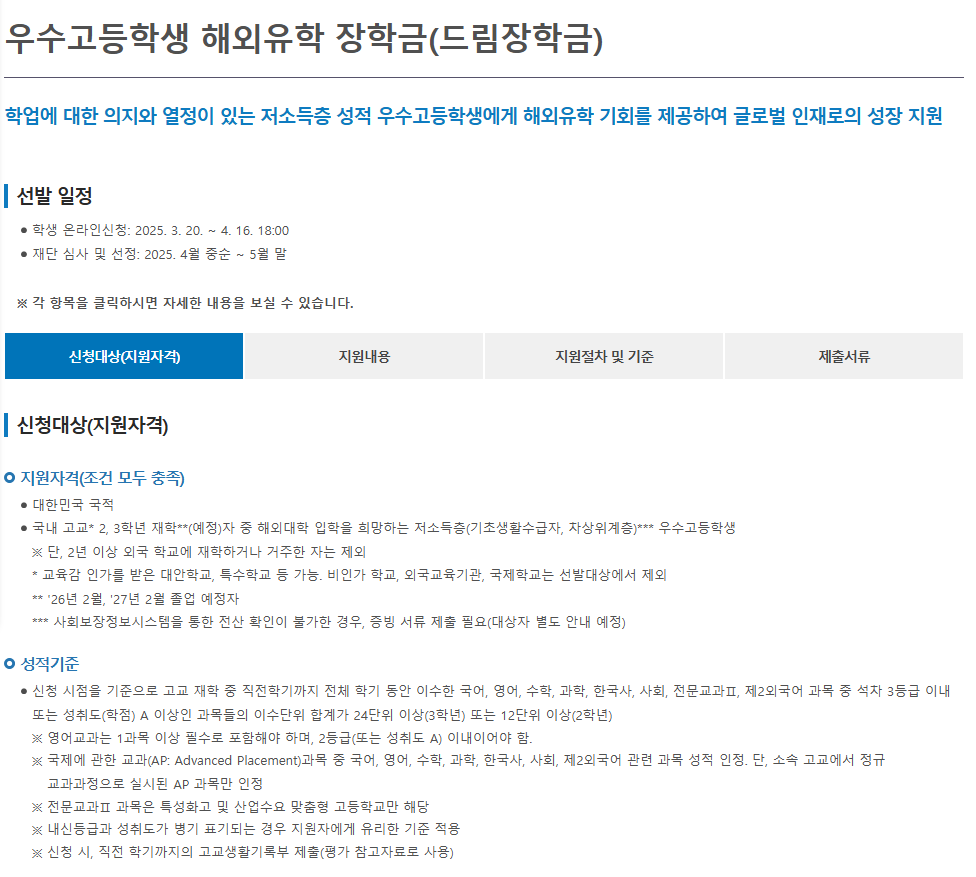📌 2025년 드림장학금 개요: 저소득층 우수고교생의 글로벌 도약