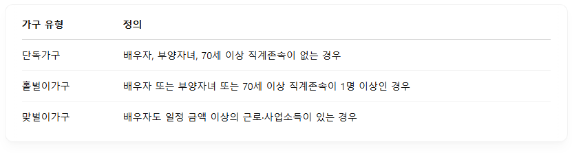 장려금은 신청자의 가족 구성에 따라 3가지 가구 유형으로 구분되며, 이에 따라 지원 금액도 달라집니다.