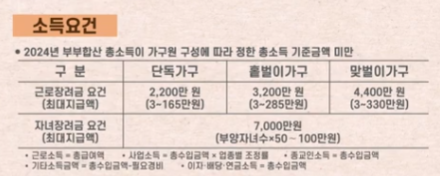 2024년 1월 1일부터 12월 31일까지의 총소득 기준이며, 가구 유형별로 다음을 초과하면 안 됩니다.