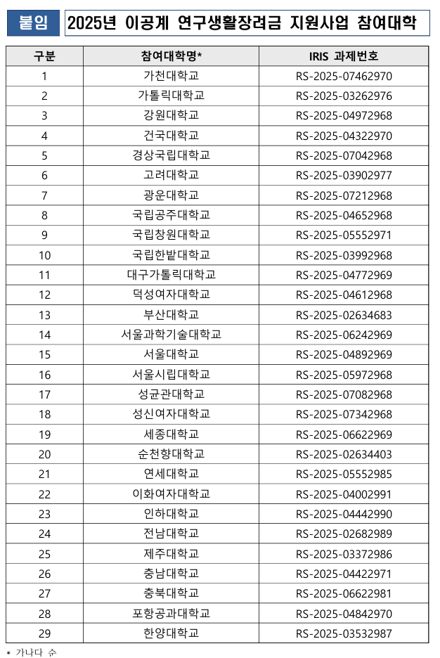 2025년 5월부터 선정된 29개 대학의 이공계 석·박사 대학원생들을 대상으로 매월 연구생활장려금을 지원할 예정입니다.